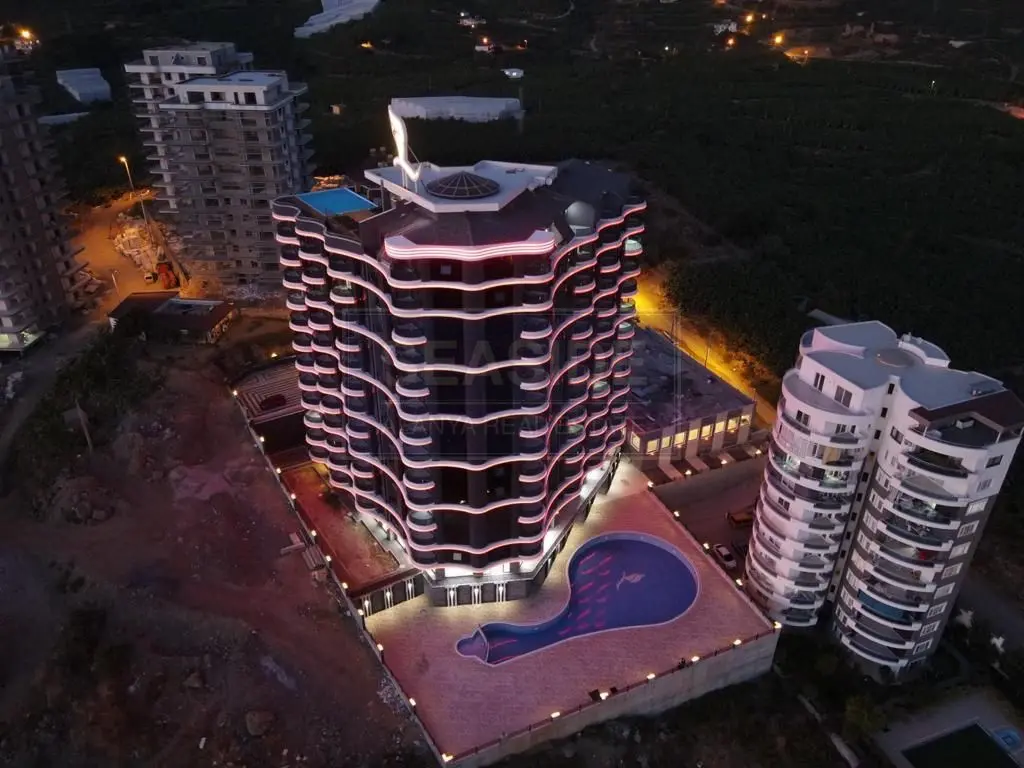 The complex features a large outdoor swimming pool, a spacious indoor pool, and an open rooftop pool on the 12th floor with a breathtaking panoramic view over Alanya. Several facilities, including pools and workspaces, offer beautiful sea views, creating a unique living atmosphere.